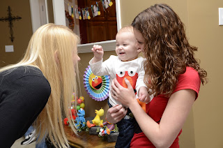 Walking to Grammy. He will walk everywhere while holding on to one hand. He can take 2-3 steps on his own, but still hasn't quite figured it all out quite yet. From what everyone tells me, that is a good thing.